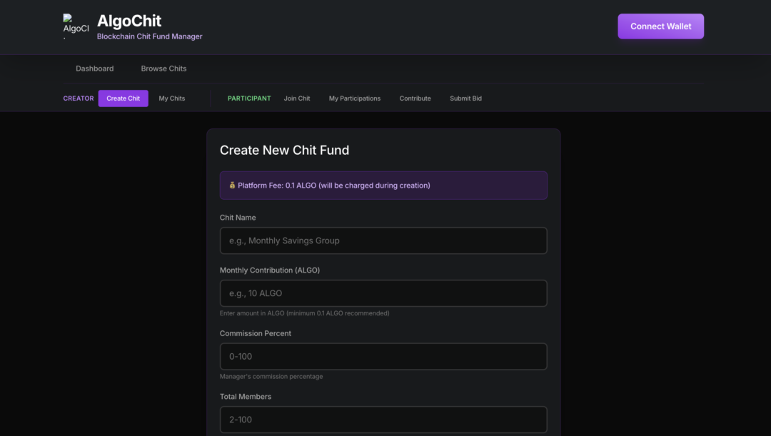 IITRookies developed AlgoChit, a transparent and fraud proof Bid Chit Fund on Algorand. The platform uses smart contracts to automate contributions, bids, and payouts, replacing manual and opaque traditional systems. It offers verifiable records and tamper proof operations for community finance.
